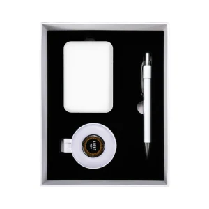 Technology Items Gift Set GS-058: Contains 3 products as listed beside and is packed in a white cardboard box with a magnetic closure and cushion inside for product protection.